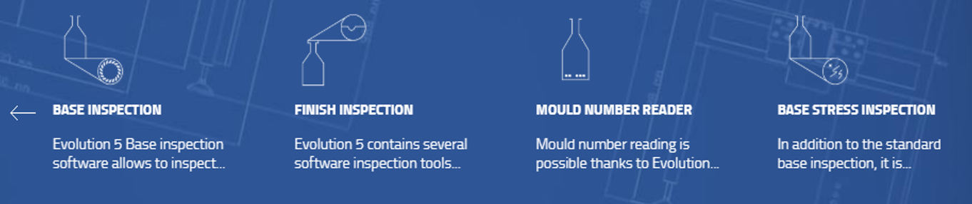 Con 12 vistas de la misma botella, Evolution 12 asegura una cobertura del 100% del cuerpo y la pared lateral de las botellas. La inspección de tensión se realiza utilizando las mismas fuentes de luz y cámaras adicionales dedicadas a la detección de tensión.
